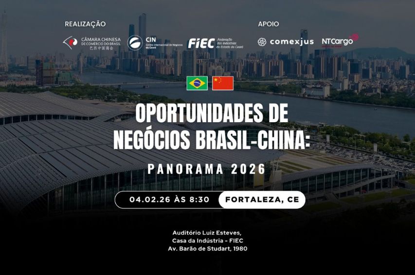 O Centro Internacional de Negócios (CIN), da Federação das Indústrias do Estado do Ceará (FIEC), em parceria com a Câmara Chinesa de Comércio do Brasil, realiza no próximo dia 4 de fevereiro o evento “Oportunidades de Negócios Brasil-China: Panorama 2026”. O encontro acontecerá na Casa da Indústria, a partir das 8h30.